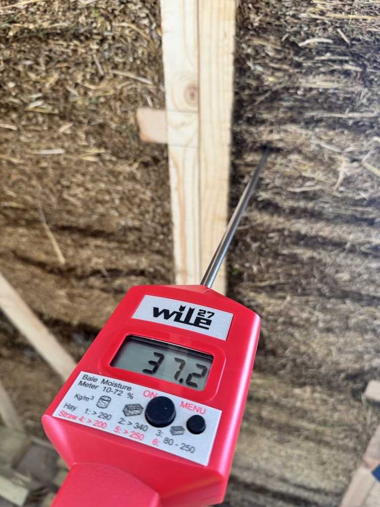 • Visible moisture detection, so problems can’t hide inside walls. Any moisture that gets into the panels during construction is visible in the straw, or in the clay plaster applied internally. Regular checks of moisture levels with moisture meter during the assembly are essential part of the construction process.