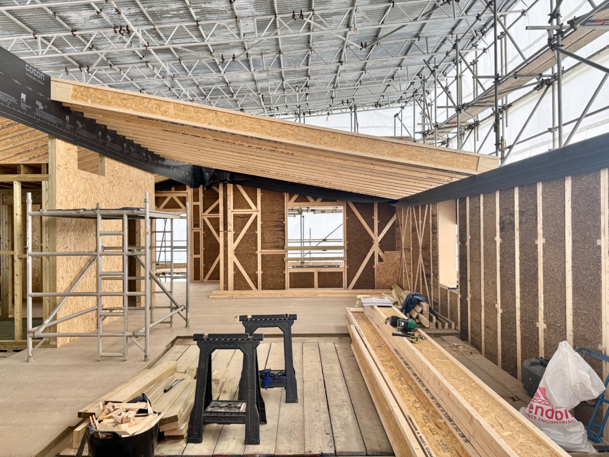 - Thermal-bridge-free design that reduces condensation risk. Our panels are twin stud timber frame; outer and inner studs are typically only joined by two thin plywood boards at top and bottom of each panel. This significantly reduces thermal bridging across the panels. A rigid woodfibre insulation board is typically installed to the outside of the panels, providing additional layer of continuous insulation and reducing any residual thermal bridges further.