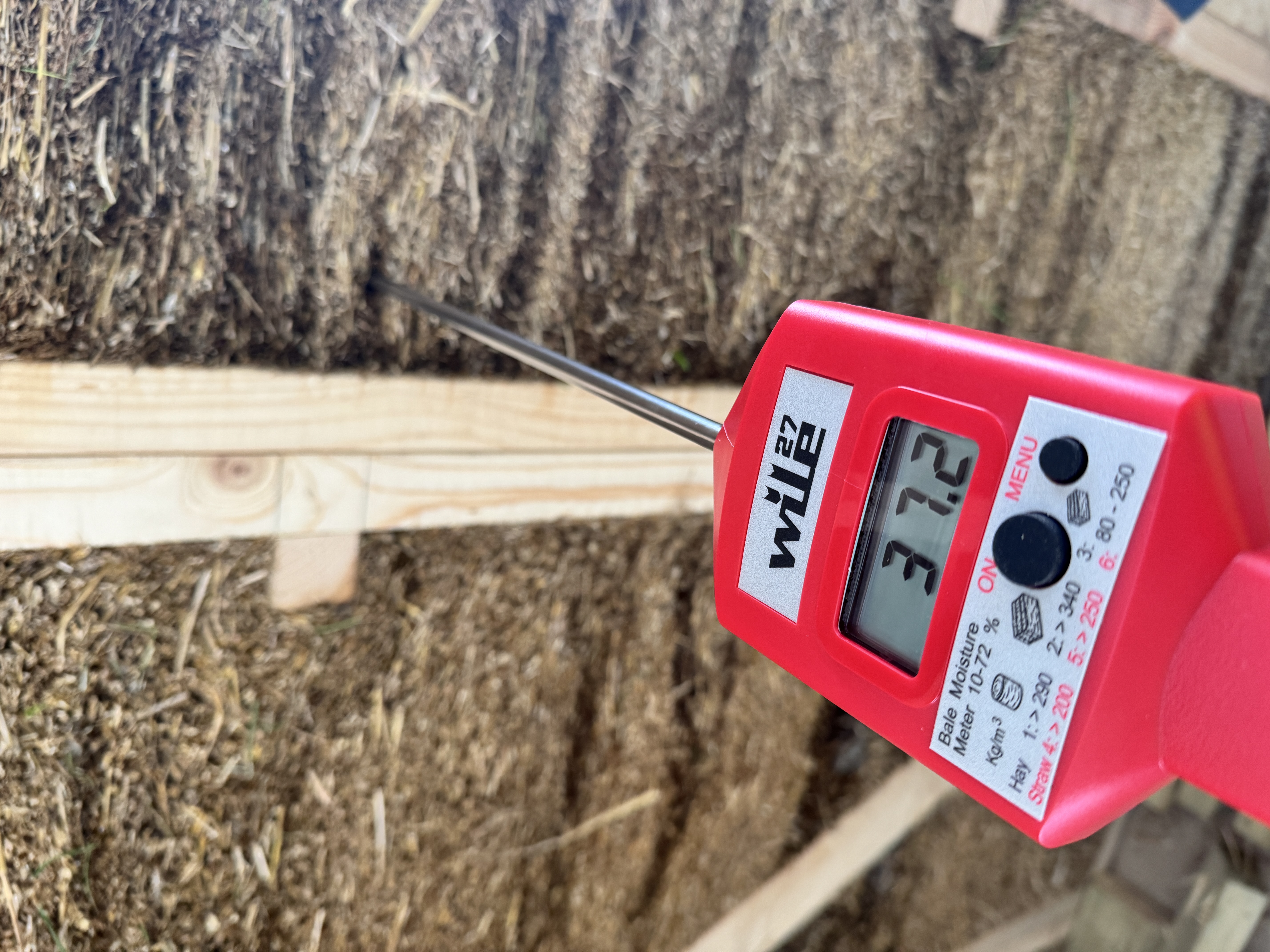 EcoCocon works closely with farmers local to our production facilities to ensure straw is harvested under the right conditions. Straw is cut only when fully mature, on dry and sunny days, and never when morning dew could introduce additional moisture. Before baling, moisture levels are measured to confirm the straw is below 20%, a value that plays a central role throughout the entire manufacturing and building process.
